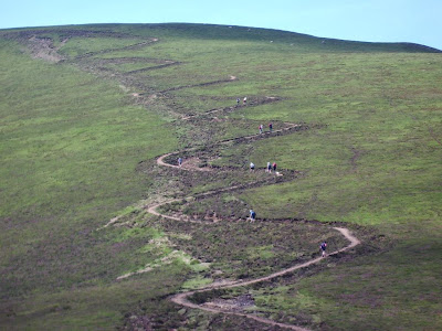 Further down the path back to the car the surface had been repaired by tipping truckloads of small rocks into the channel caused by thousands of boots, so that instead of a gentle walk down I had to pick my way from rock to rock like on a rocky beach. Not a particularly welcome activity for legs that were becoming tired. The battery of my VX-8GR finally expired during a contact with a SOTA summiteer in Northumberland whose call I heard on the walk down, so there being no point in taking the loop over Barrow I walked straight back to the car and came home.