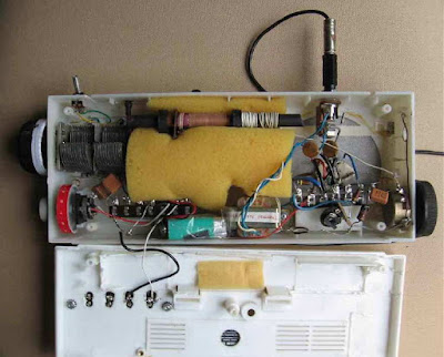 From the discarded MW / LW receivers there were several 2-gang variable capacitors and their tuning coils wound on ferrite rods - and of course lots of fixed capacitors and resistors. Many years ago a friend had passed to me the result of his construction of a basic amateur receiver (Heathkit RA1). That was useful because of the lack of a circuit board - the components were just soldered to lugs, most with still usefully-long wires. It also had a full list of parts and simple advice on construction. One of the old portable receivers I'd found had a plastic case that looked suitable for housing things (about the right size and shape, easy to drill, etc.).