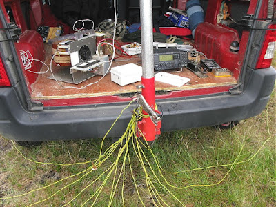 In the period leading up to all this it was necessary to build and test a viable portable station based on the use of my Berlingo van. A 30' part of a 40' Spiderbeam fibreglass pole was used with a simple round wooden peg to secure the 'Tee' wire antenna, which was fabricated from twin twisted multistrand speaker wire. The vertical used both, while the rest was pulled apart to form the two horizontal legs.