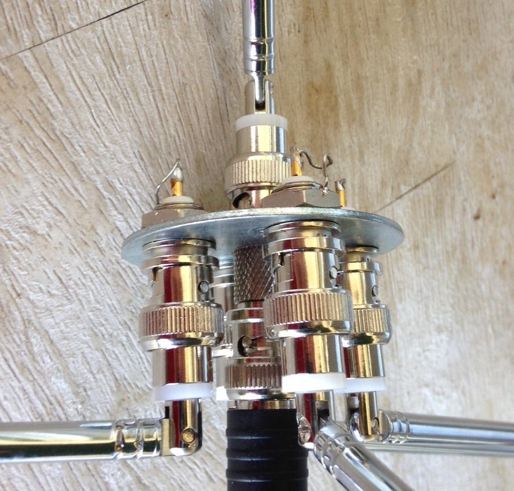 I used BNC female connectors from, Digikey, a good source for components! The center post of this connector is shorted to the ‘shell side’ to provide a ground plane with all the radials!
