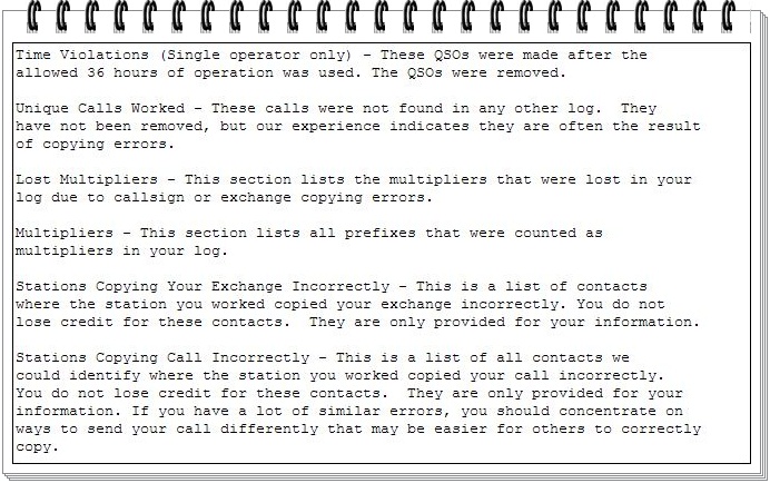 The RadioSport log check report (LCR) is my adjudicated score that is my official score after software verifies complete and accurate exchanges including the callsign of the station. The LCR is my performance report. I recommend familiarizing to the level of knowledgeable because there is a cause and effect relationship when a station is logged.