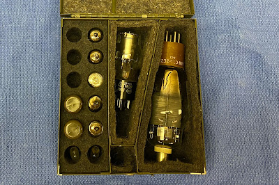 There's another bag (shown above) for carrying power supply cables, keys, hand mic, long wire and doublet antennas, external speaker, torture device headphones, torture device in-ear phones, as well as a box of spare tubes for the radio.