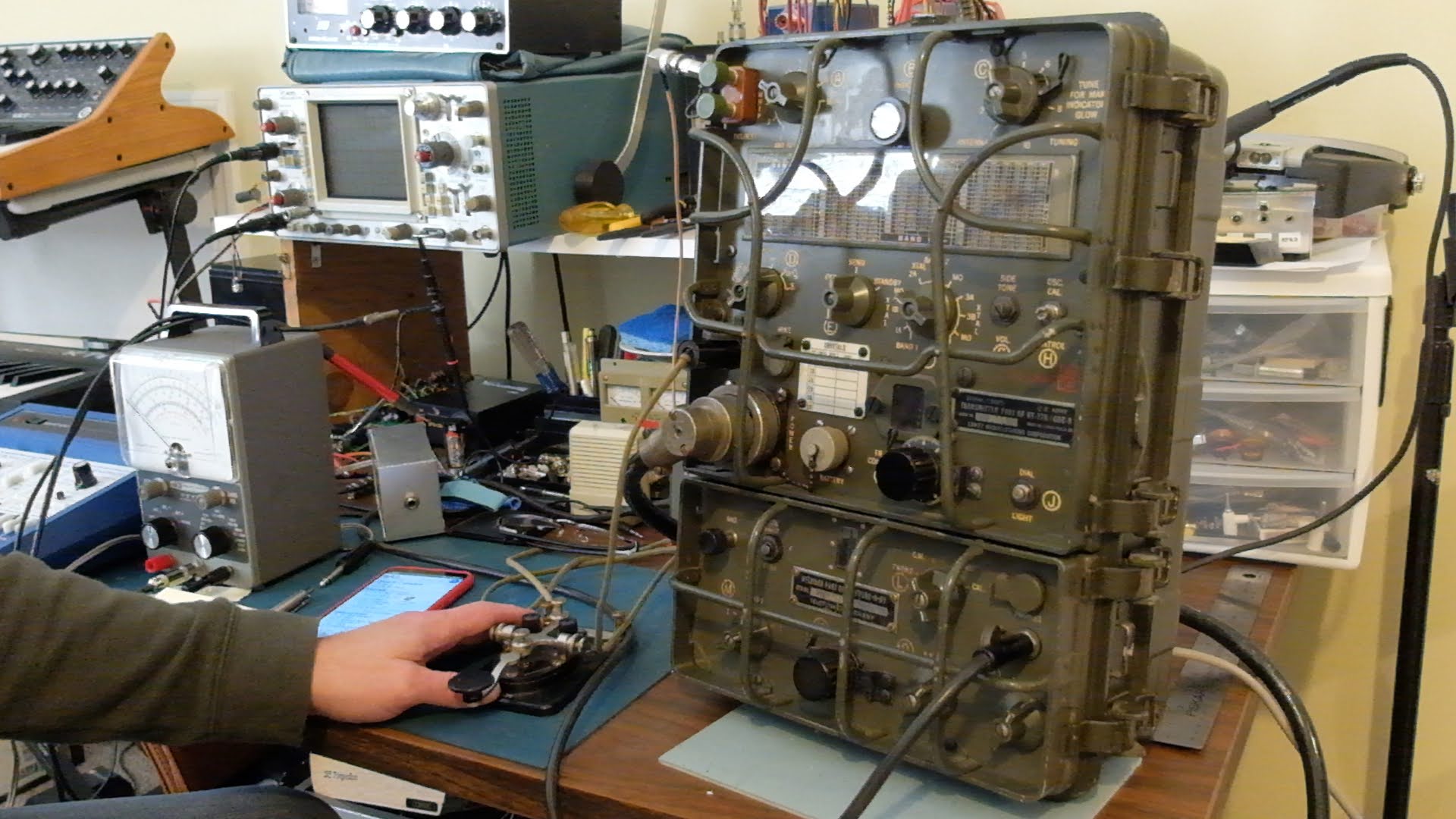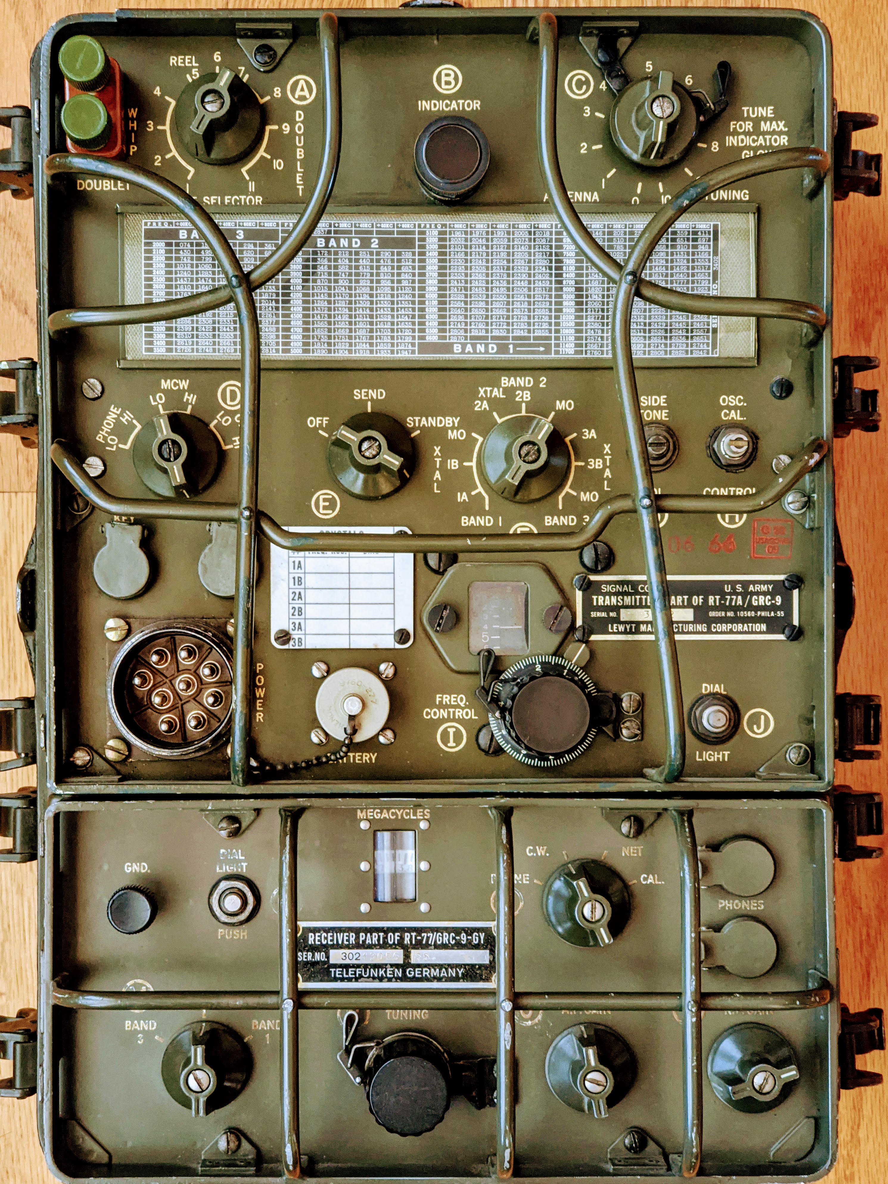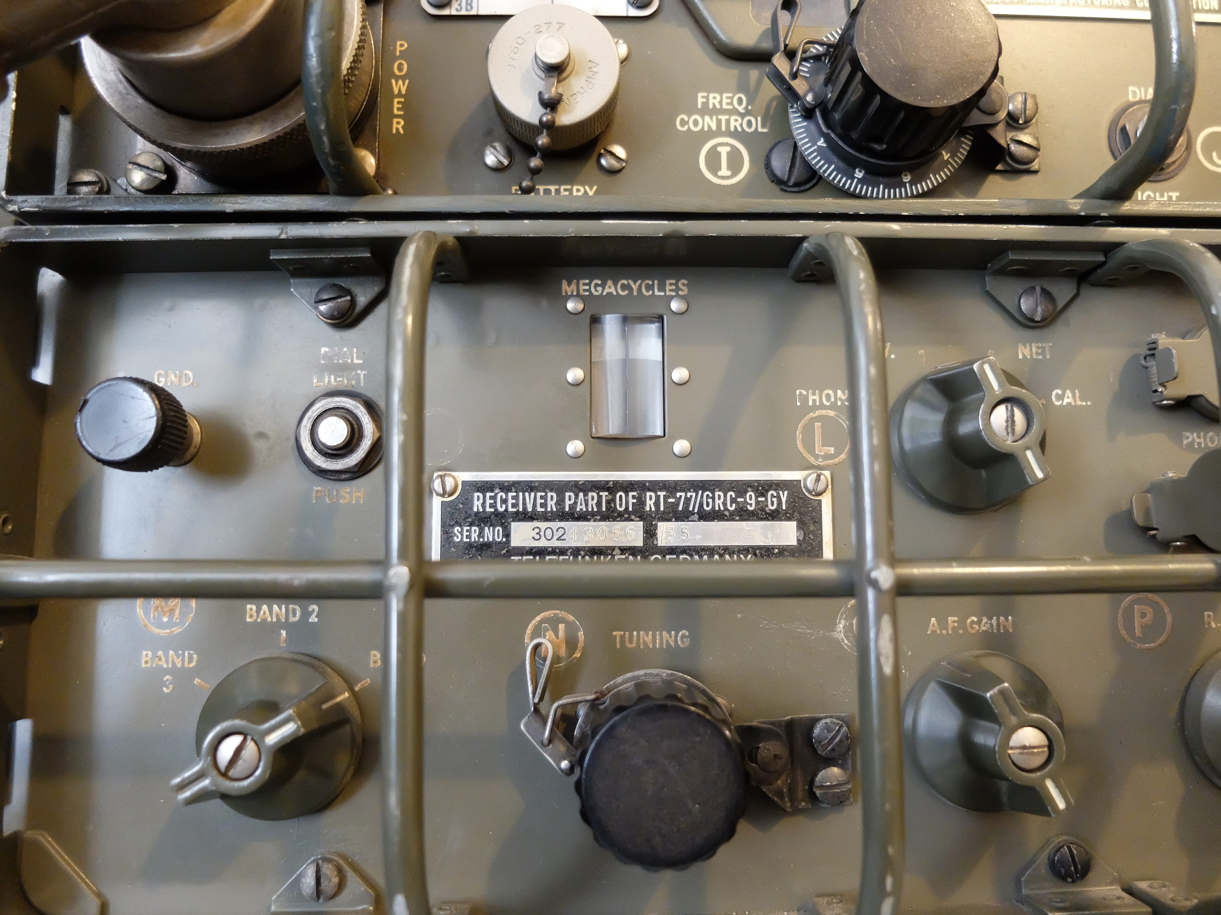 The AN/GRC-9 is a set of components primarily comprised of the RT-77/GRC-9 receiver-transmitter, capable of operating between 2-12 MHz in CW, MCW and AM modes. MCW is a modulated form of CW that can be received by radios that do not have a BFO (i.e. a normal AM receiver).