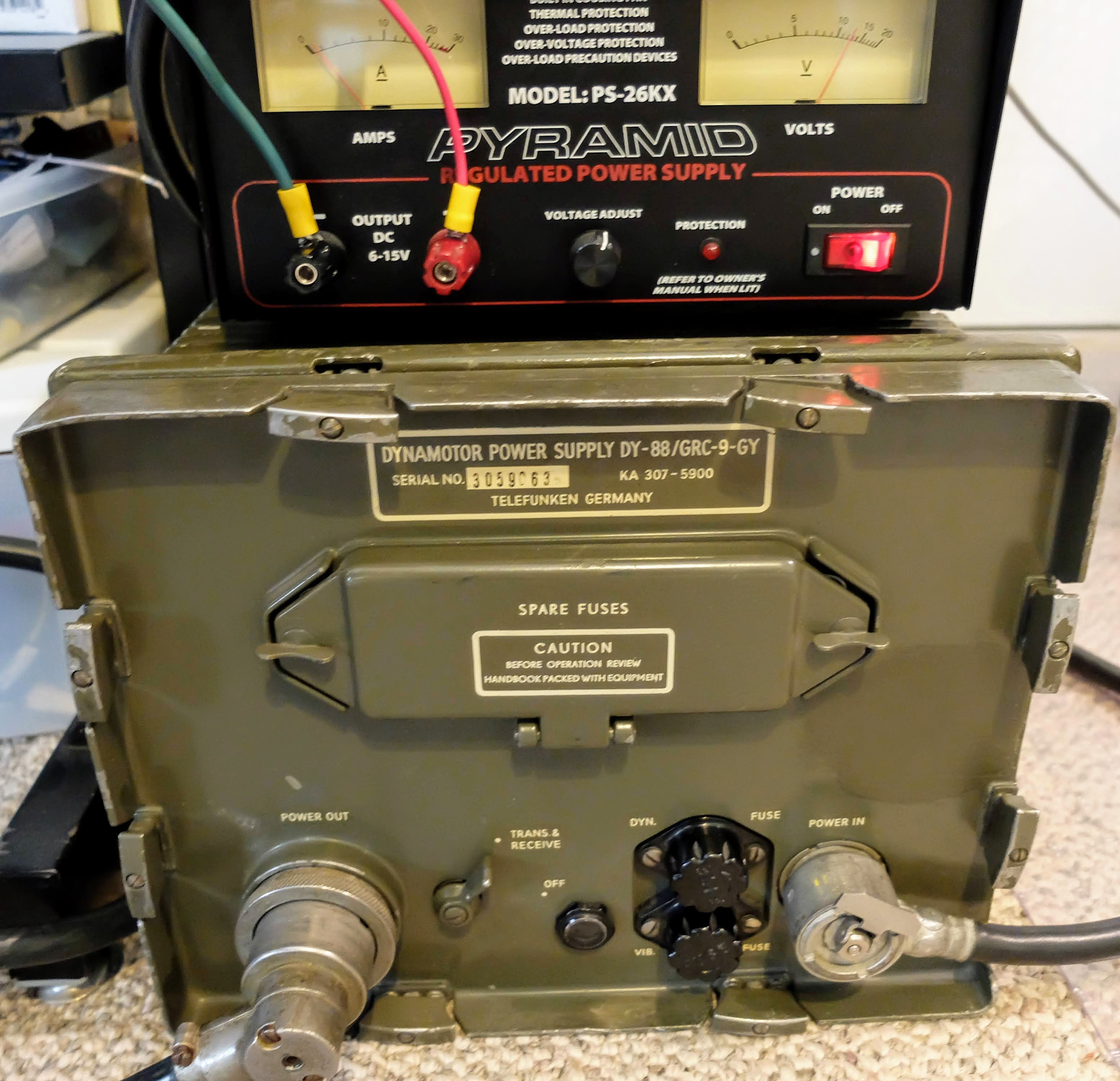 In the few days I've had the AN/GRC-9 the only problems I've encountered have been related to the old DY-88 power supply. Old vibrators cans are generally seized up, as was the case with mine. Eventually mine became un-stuck after repeated applications of power but there are some methods to restore truly frozen ones using AC current and light bulbs (see Notes section below).