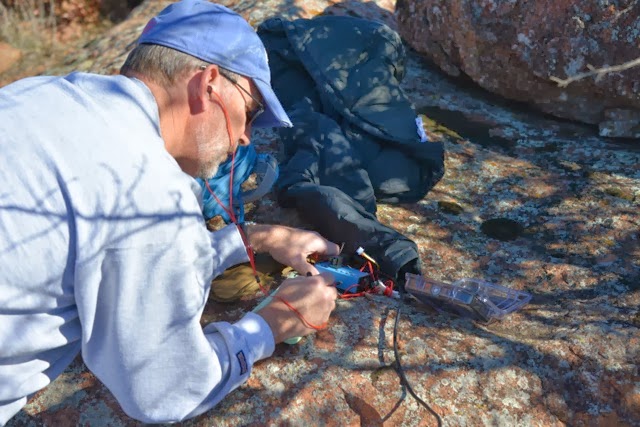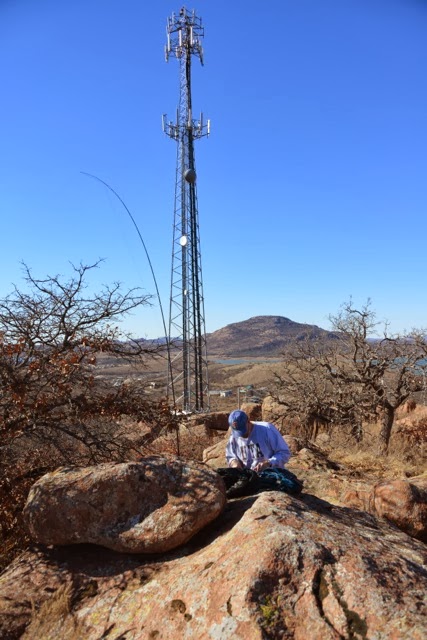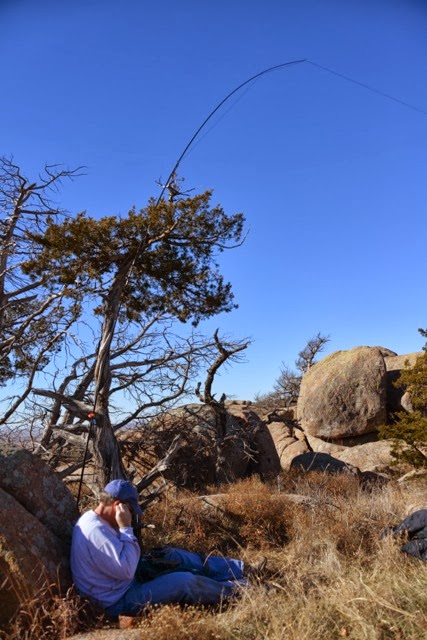 The views from Mt. Scott are fantastic, mainly because the mountain rises above the relative flat plain of grasslands. Lake Lawtonka is part of the backdrop. But it was a little chilly. The tree in the foreground of the picture is what I used to support the end of my antenna which I then brought to the operating position down my carbon fiber fishing pole.