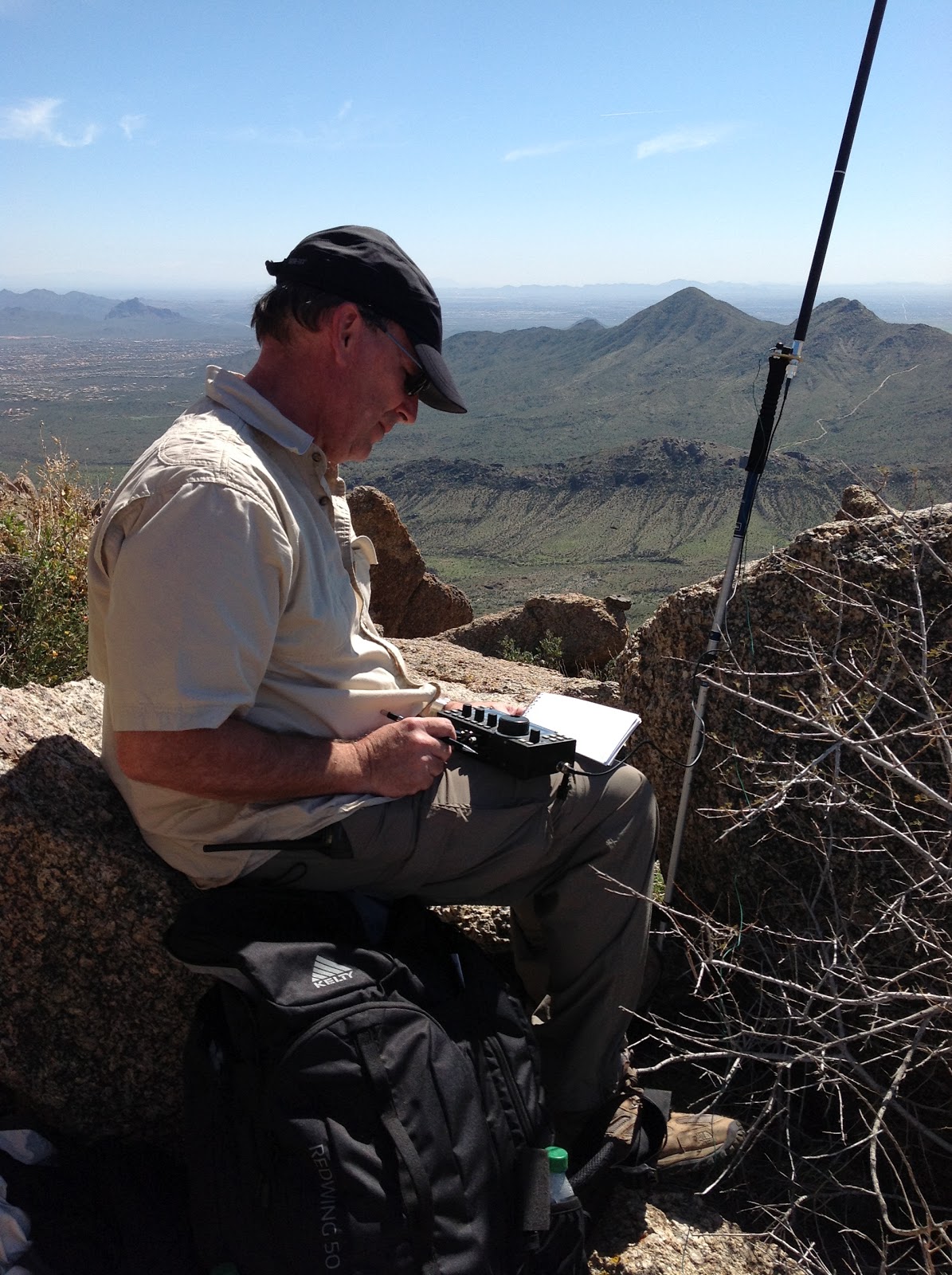 The packing for the trip took some thinking, but to keep this story from getting too long, my station consisted of a Buddistick vertical mounted to the top of my hiking stick, an Elecraft KX3 and a 4 amp/hour battery for my power supply. The hike up the mountain was pretty tough as the last 400 feet were without a trail. There were a lot of boulders, cactus and thorny bushes to navigate, however, we found our way to the summit to set up the station. Since this trip occurred on a Wednesday, the number of summit chasers would be limited, but I had announced the activation, so I knew there would be a few folks waiting on me.