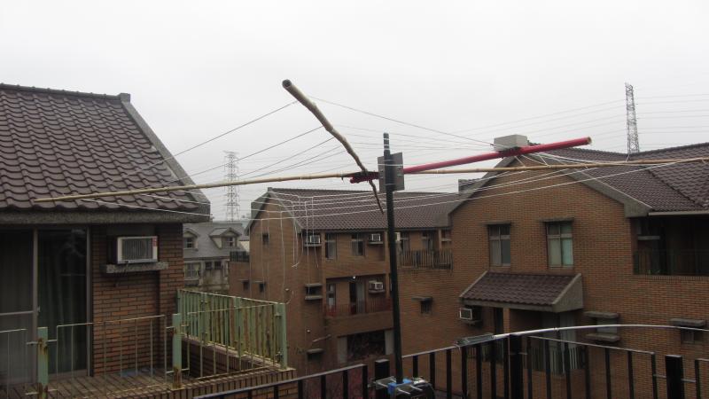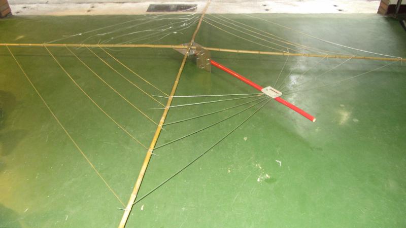 I’m still on a very tight budget, so the antenna had to be build on the cheap. That means thinking outside the box and starting with taking a good look around you. Fishing rods are expensive here. The cheapest I could find were almost 400 NT dollars per piece. But hey, we’re in Asia: bamboo is cheap, but it is also strong and lightweight. So I spend 200 NT dollars (5 euro’s or 7.50 USD) on bamboo instead of 2000 NT on fishing rods. Aluminium is hard to get in Taiwan, because people find it too soft. Stainless steel is widely used, so the local iron monger cut me two pieces for a little less than 200 NT dollars. U-bolts were also cheap at the local hardware store. Twin lead costed me 400 NT dollars for 50 meters and after two days of work it all looked like this….