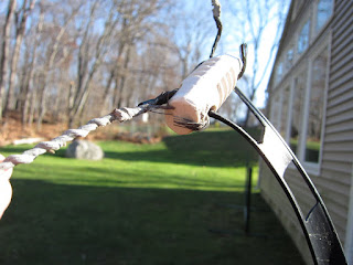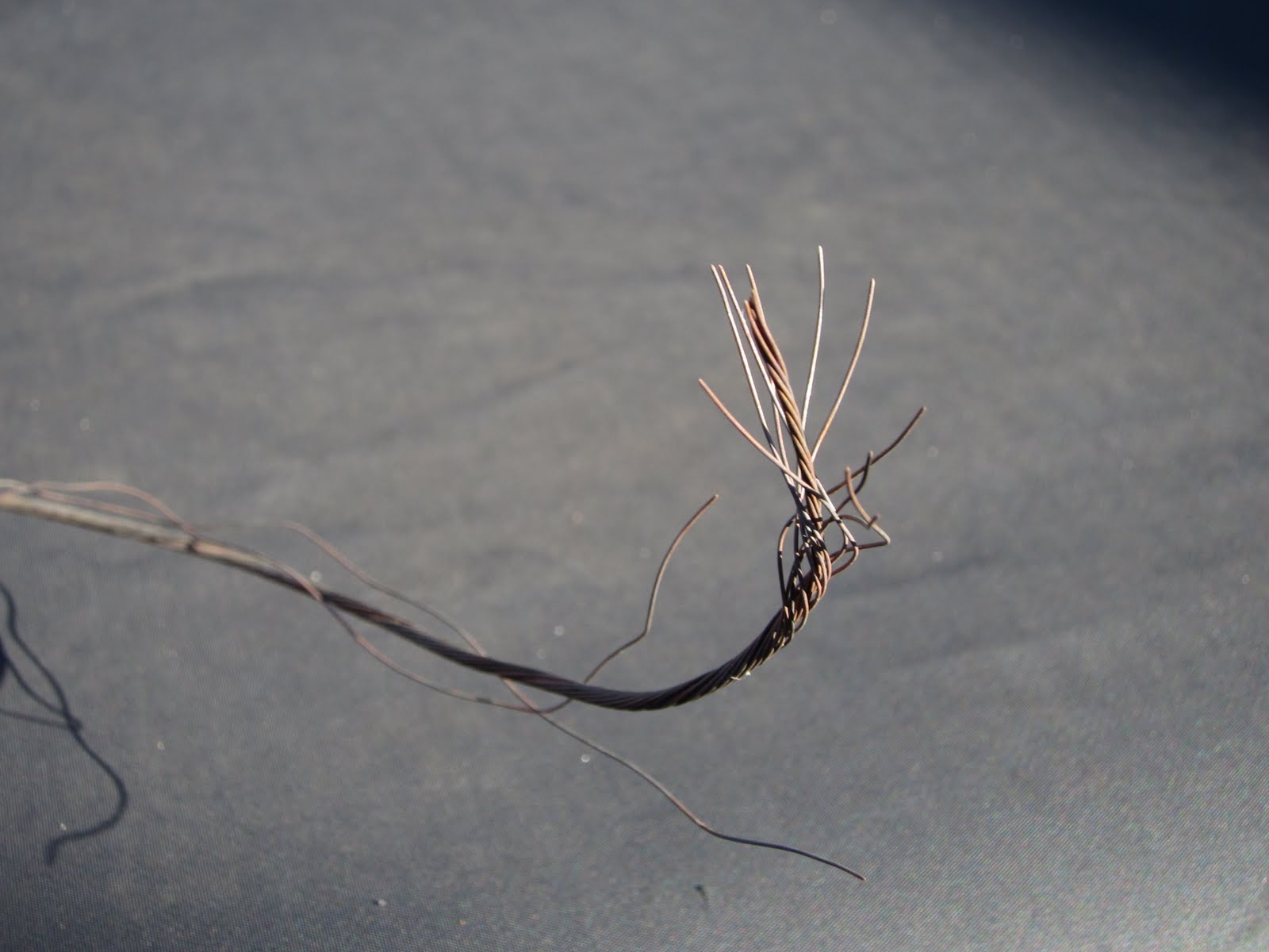 It was bound to happen sooner or later, but that doesn’t really make it feel any better. At the edge of my backyard there is a tree that I was pretty sure had died (given the lack of leaves through the past spring and summer), and I’d planned on having a tree service look at it next spring. A series of rainstorms with a lot of wind passed through my part of the world yesterday (I’ll bet you can guess where this is going). One of the three small trunks from that dead tree snapped off about 8 feet in the air and fortunately fell parallel to my house so the house was OK. Unfortunately, my G5RV antenna passed through the upper branches of the tree and unsurprisingly was unable to withstand the force of the falling tree. The image you see to the right is a piece of one of the wire legs that use to be up in the air. It is, alas, no longer up in the air.