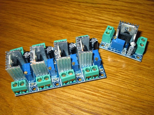 I have a few various projects to build over the next couple of years, some that will require a regulated supply to feed various DC Volts (low noise is a must!). I had been running through my mind various ideas using regulators on some stripboard to mate up the supply rails, I had a few emails between my friend G0FTD on the subject, he said take a look at these "5" seperate LM317 boards already made up on a PCB, complete with heatsinks for just over £5 ($8 US), which works out at just over £1 each! I couldn't even buy the heatsink for a £1 over here, never mind the LM317 and the PCB. I ordered five they arrived within 10 days from HK, a couple of the LM317's were not bolted up tight to the heatsinks, but a quick tighten with a screwdriver and all was ok, what a bargain!