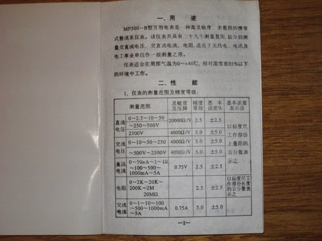The manual isn't up to much, as 99% of it is written in Chinese. I am able to decipher that it is an Industry standard 20'000 Ohms/V meter on DC +/- 2.5% , except 2500V @ 4000 Ohm/V. On AC ranges it is 2500 Ohms/V +/- 5% accuracy. DC Current (I) is +/- 2.5% & AC Current +/- 5%.