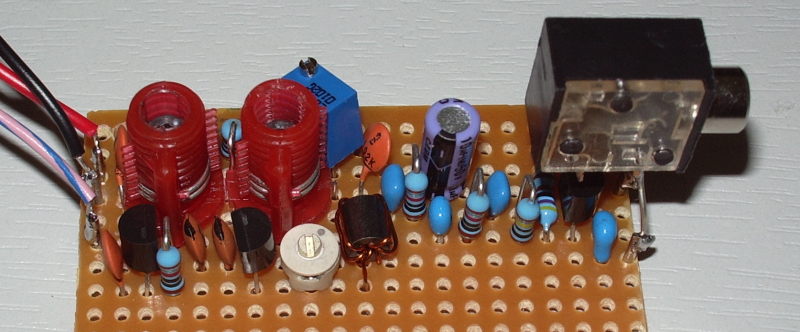 Because this is a VHF circuit I didn’t think I could try it out on the breadboard so I made it up directly on to Veroboard. The layout is pretty similar to Roger’s original layout from what I can tell from the pictures on his website, although I think he made an etched circuit board, something I’m not able to do.