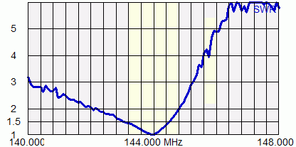 The SWR is almost 1.0:1 at 144.0 MHz, as the plot from my AA-200 antenna analyzer shows, but it rises steeply to 1.4:1 at 144.4MHz and 2:1 at 144.8MHz. Clearly I had better not use this antenna to work satellites.