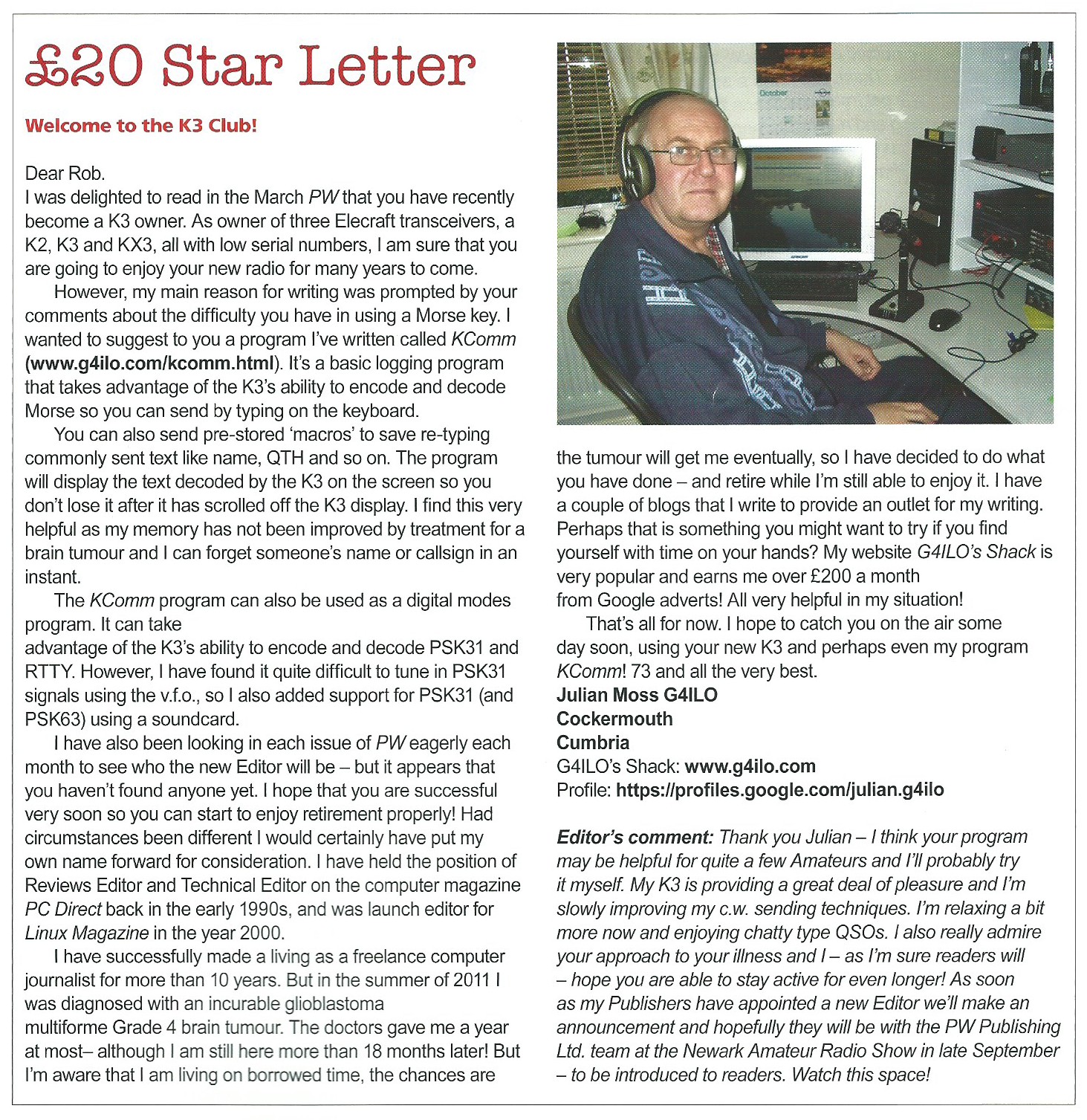 I forgot about the email until a few weeks later when I received an email from Rob asking permission to publish an edited version of it in the next issue of PW. I hadn’t expected that but agreed to it and also sent a picture of me in my shack. I was quite surprised when my letter appeared almost word for word as I had originally written it. I was even more surprised to find it was the star letter for that month! I hope you found it interesting. I’m sure the £20 when I receive it will be put to good use!