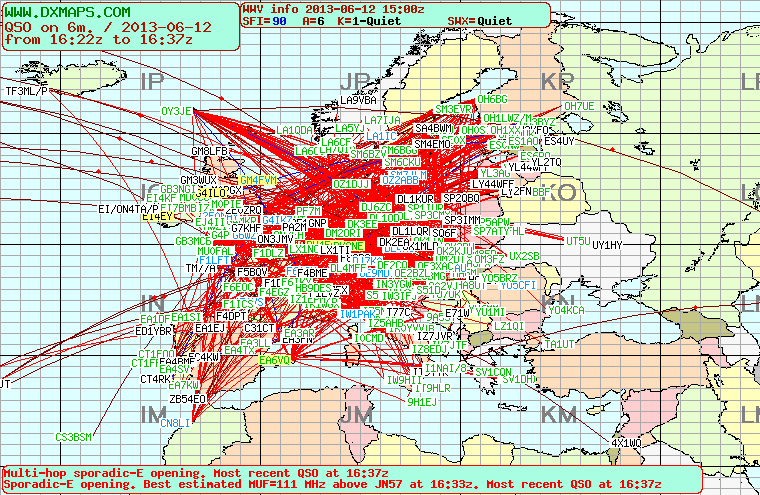 This snapshot of activity from DXMaps gives an idea of what the opening was like at its peak. The whole of western Europe must have been covered by a reflective Sporadic-E cloud!