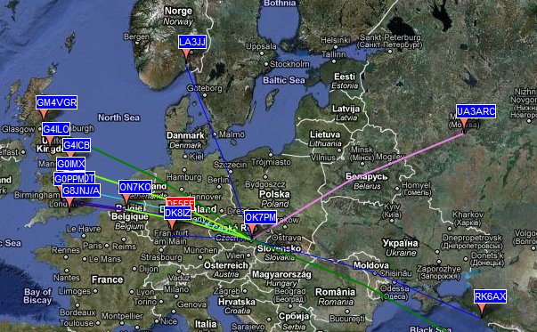 The first bit of live data I received from my APRS VHF propagation alert reflector was a warning of a possible Sporadic-E opening on six metres. I was rather surprised that there was Sporadic-E this early in the year, but I went to the DX Sherlock website and sure enough contacts had been reported between a station even further north than here and one in the Czech Republic. I then clicked on the map to see the actual contact details and was surprised to find they were WSPR spots!