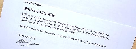 On looking through the mail at lunch time I saw that I had received a letter from Ofcom. My NoV permitting me to operate on the 60m experimental band had arrived!