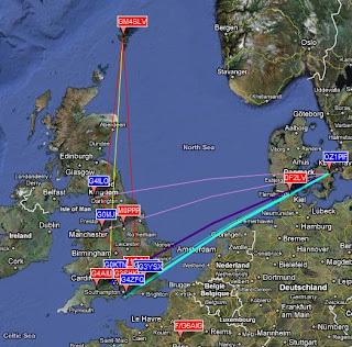 This is a shot of the WSPR propagation map taken just before 1800z today. As you can see, the 500mW is getting out pretty well. I think I have been received by all the G stations that have been monitoring at some time during the day, and a few others. And it was nice to see fellow bloggers Paul PC4T and Bas PE4BAS monitoring even though they can’t transmit on 60m, and better still spotting me!