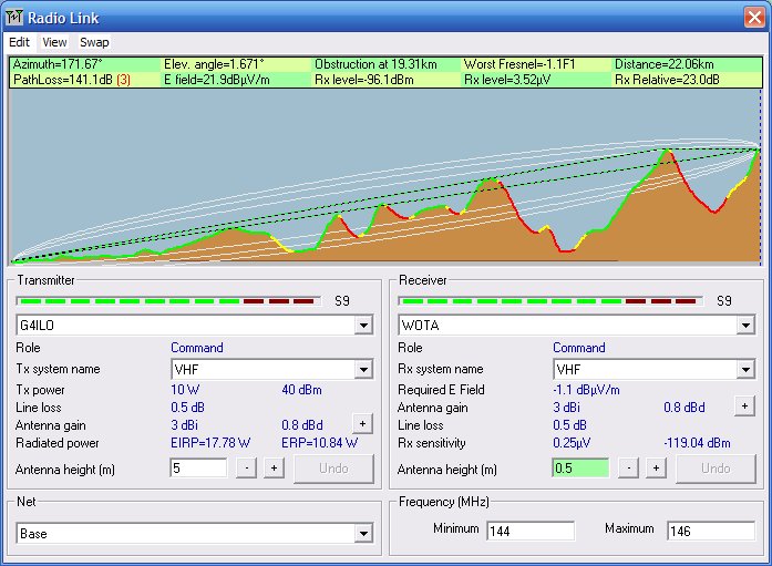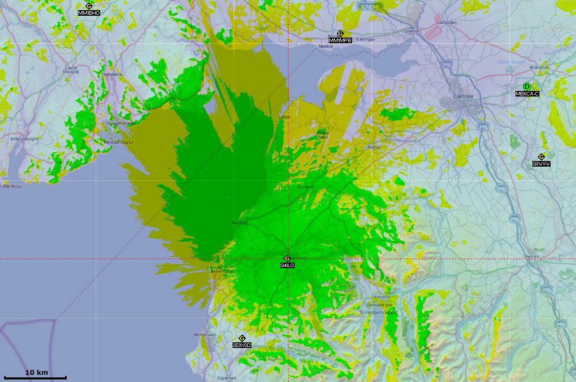 I thought the coverage plots were rather optimistic judging by experience so I had to change some of the parameters and choose the “worst case” to get a plot that looked reasonable. This being VHF, it’s possible that the fact of my antenna being located in the attic could result in some degradation of the signal. I felt the default colouring of green for 3dB over noise or better and yellow for 3dB below noise to 3dB above didn’t give a realistic picture so I changed the colouring so that green depicts 10dB or more over noise and yellow shows between 0 and 10dB.