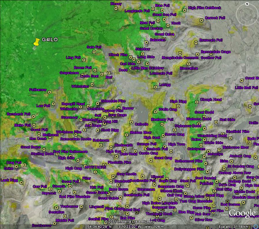 I made a new coverage map without the road map and then opened that in Google Earth. I then opened a Google Earth plugin showing all the Wainwright summits. I could then easily see the predicted radio reception from each of the summits. (Click the image to see it full sized.)