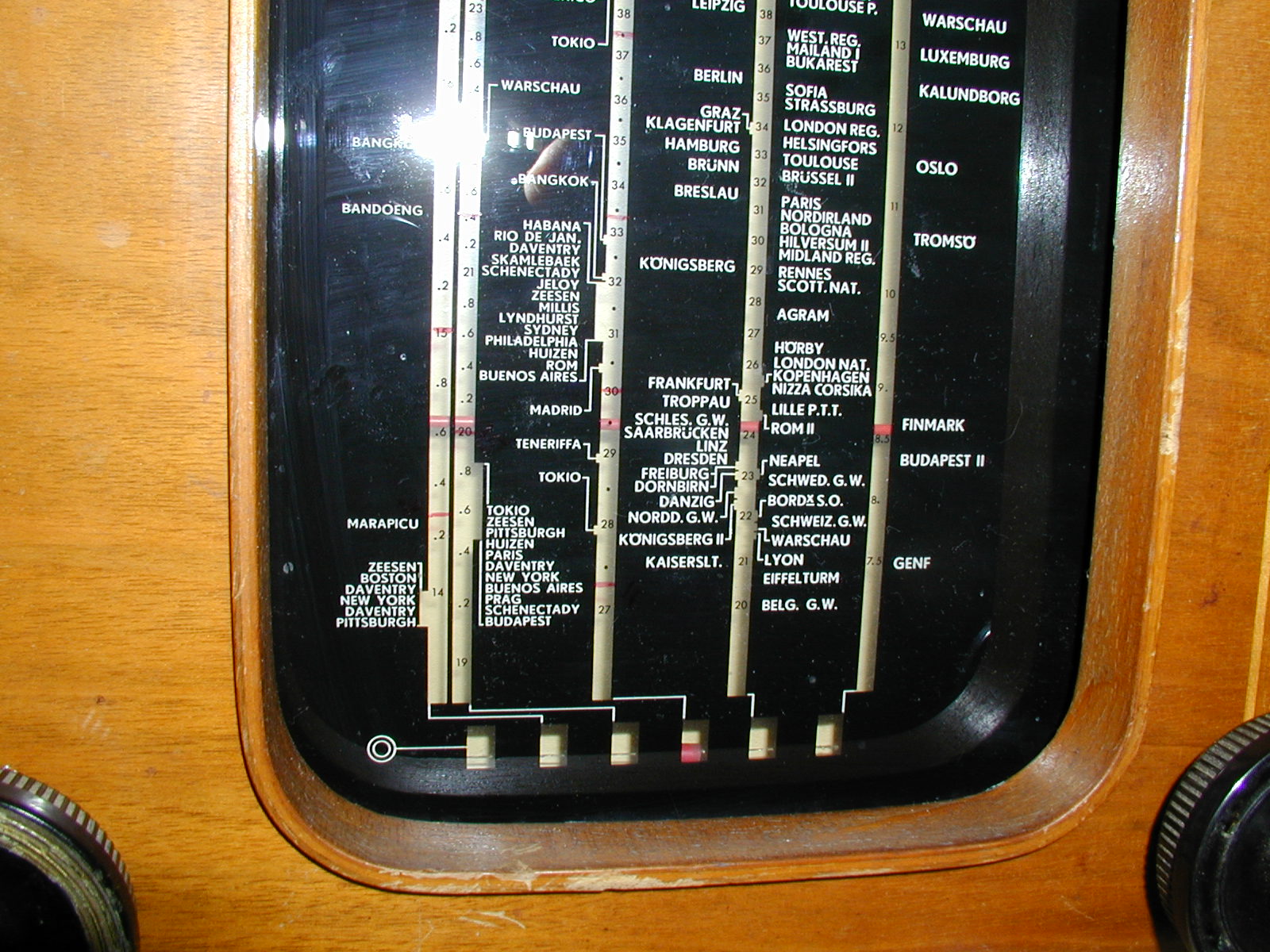 The medium wave part of the dial had a separate side on the left hand for German stations and here one can find cities that are no longer in Germany such as Königsberg on 223 m and 291 m (1348 and 1031 kHz). Today this is Kaliningrad in Russia. The dial also showed Danzig on 230 m (1303 kHz), ”Schles. G. W.” (Schlesische Gleichwelle – a single frequency net with stations in Gleiwitz and Reichenbach/Oberlausitz) on 244 m (1231 kHz), and Breslau (315 m – 950 kHz). Today these are the cities of Gdansk, Gliwice and Wroclaw in Western Poland, an area which was in Germany until the end of the war. At least the radio must have been from before the end of WW2.