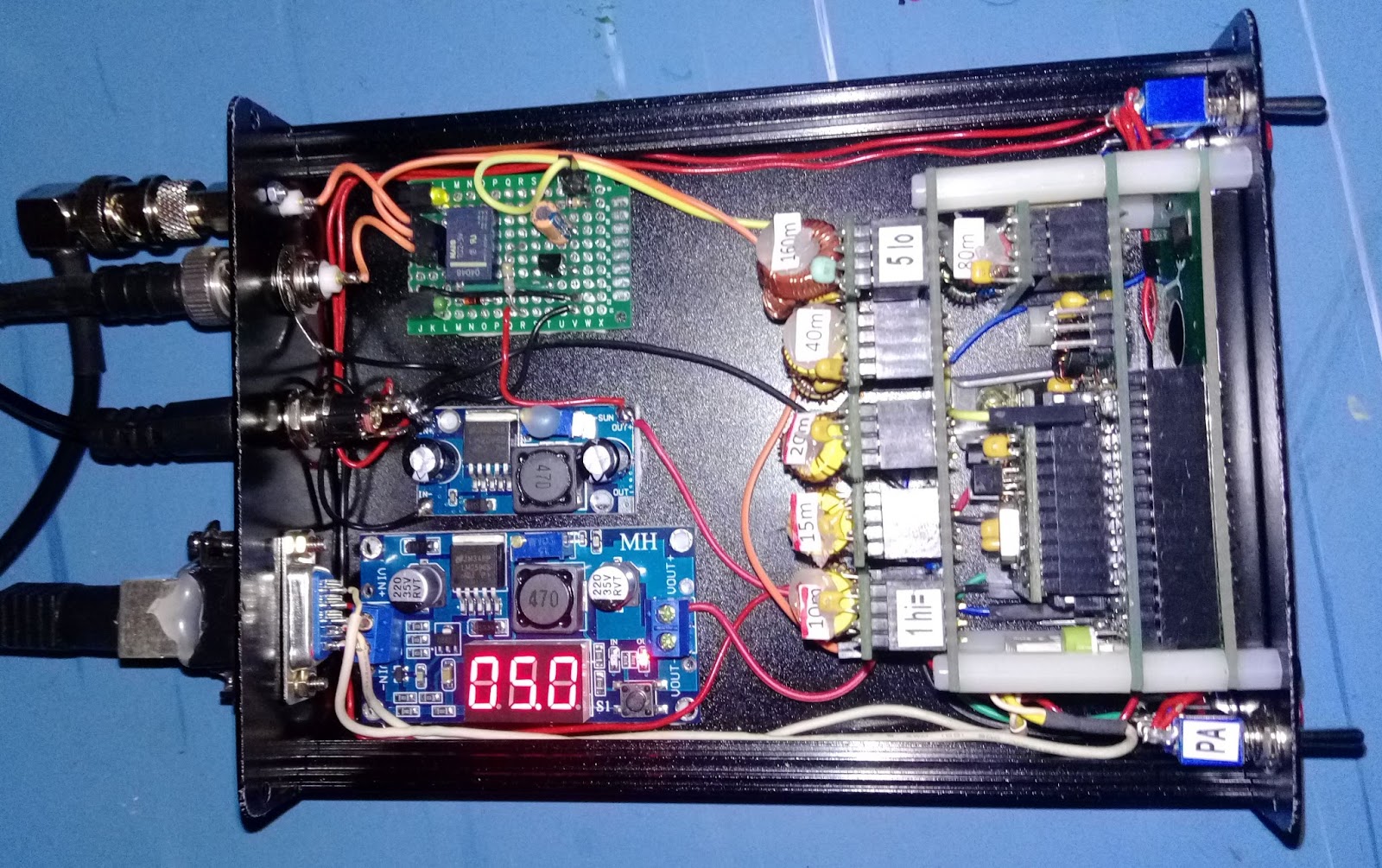 The circuit is controlled from pin D7 and consists of a transistor, a relay, a resistor and an electrolytic capacitor. In addition I have two LEDs that indicate which antenna which is in use. In the first picture the green LED in the back right under the BNC antenna connector shows that antenna 1 is connected.