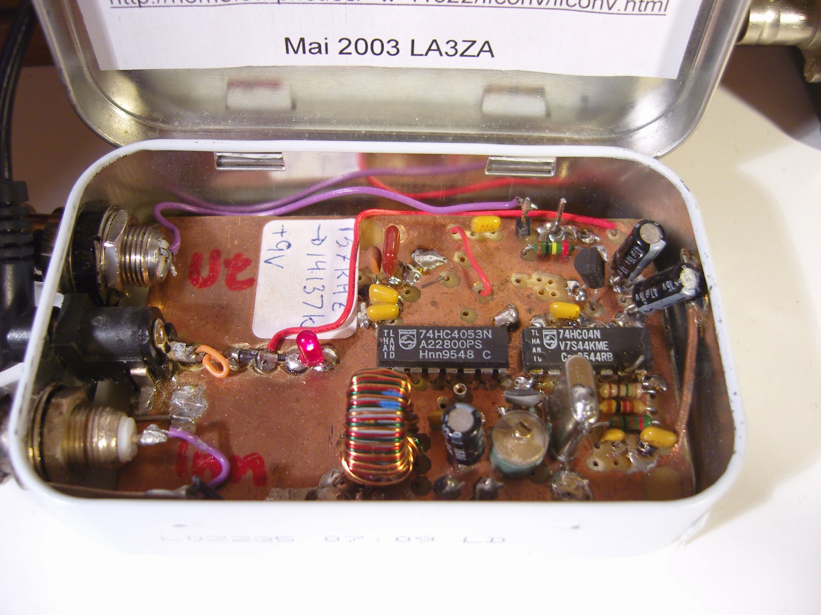 The converter is quite simple and is based on a 74HC4053 switch used as a mixer with a 74HC04 for a 14 MHz oscillator. It is the design of SM6LKM, but with a different oscillator frequency and a simplified output filter compared to his. It is one of many small projects that I have built in Altoids tins.