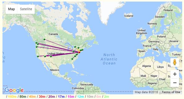 20 Meters turned out to be the better band. My farthest DX QSOs happened there with S58AL in Slovenia and ON4RO in Belgium. I also ended up working Arizona and Washington state on 20 Meters. So even though I made it to Europe, this is where the Reverse Beacon Network picked me up:
