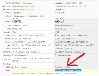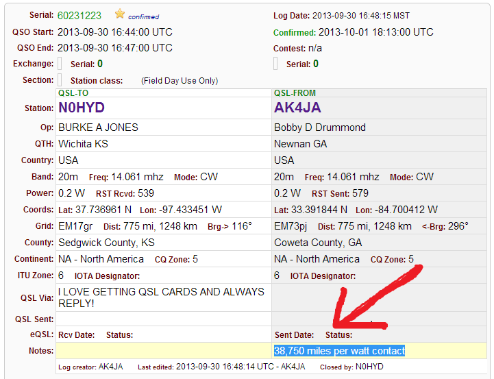 He was running 20 MILLIWATTS from a homebrew transmitter! He made note in the comments that this was a 38,750 mile per watt contact.