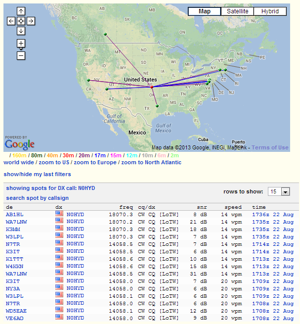 So I started off with 20 WPM and called CQ for about 3 minutes on 20 meters. You can see the spots on the photo, but I was heard mainly to the East coast and West part of the country – and one Canadian station.