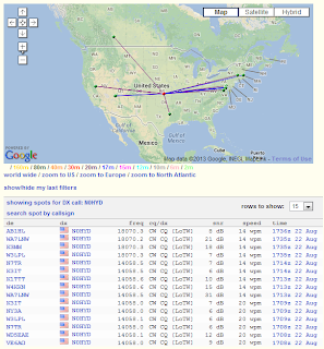 As you can see in the picture I then went to 17 meters and put out a CQ at 14 WPM and was spotted by 4 stations (3 on the east coast and one out west). I did hear someone call ..__.. (?) after one of my CQ calls but I never could reach him, and they never gave a call.
