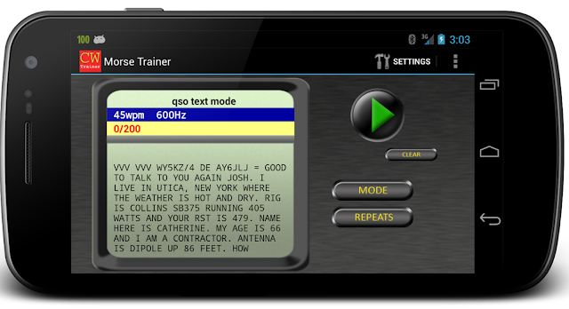 This app has all the standard Morse Code training tools such as letter training, letter groups, callsign training etc. It also can send the most common 500 words as well as a random sample QSO training mode. That's all great but what I really find useful is the ability to send your own text that you type or paste into the app and even... wait for it... an ebook reader!