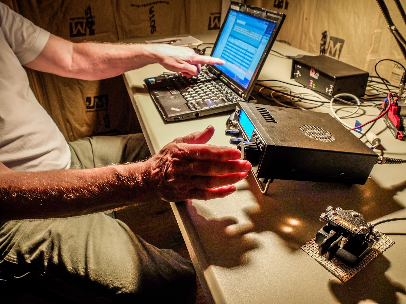 | Finding the next station to work. (N3ZN QRP CW key in the foreground) |