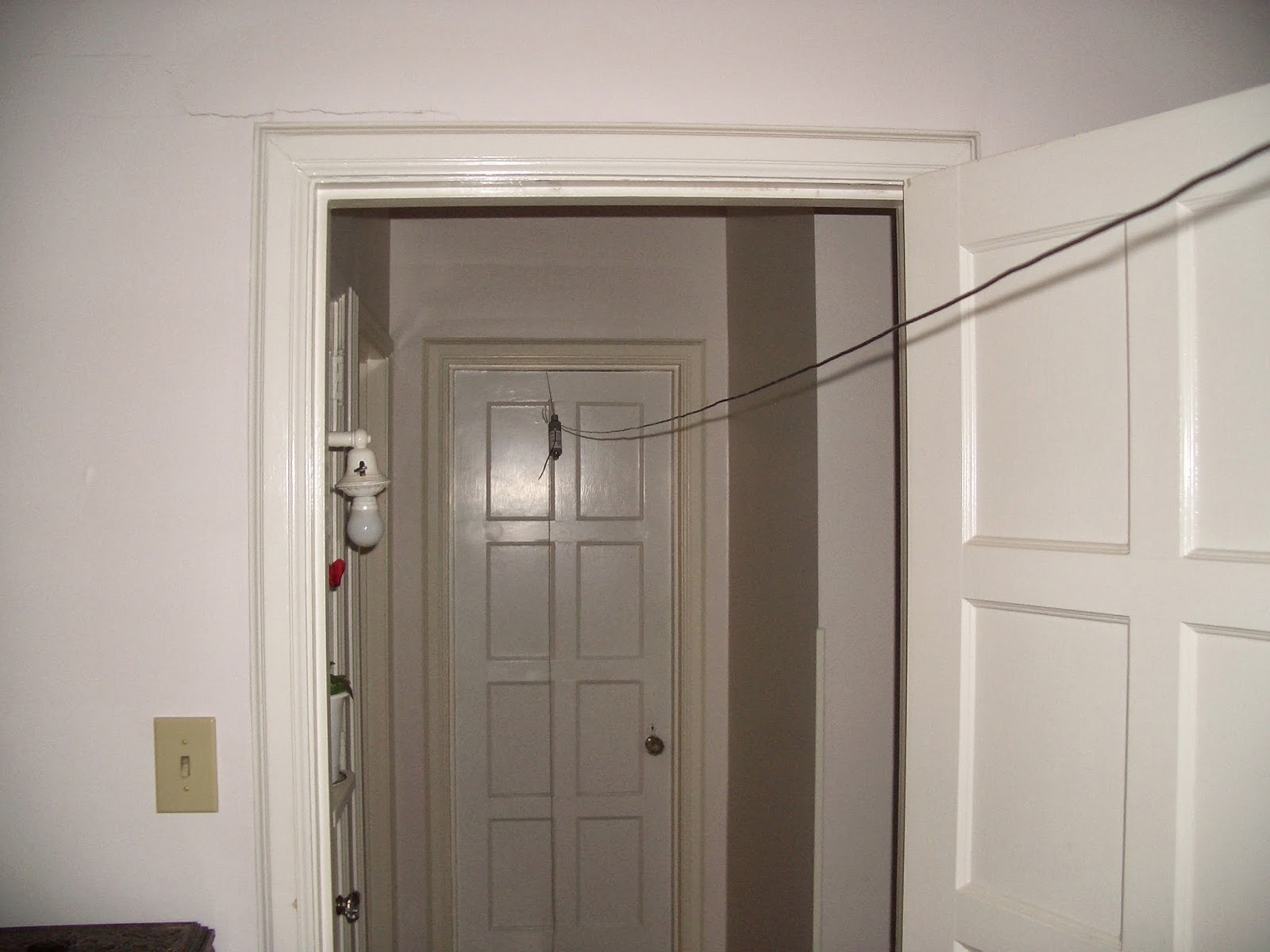 The process accelerated a little before September of 2012 when I started using “dedicated band dipoles” for my DX contacts. My indoor “upstairs” space is very limited but I’m able to stretch out a dipole for 10 meters and 15 meters. Those two dipoles barely hang between the wooden curtain rod, on one side of the house, and the bathroom window sill, on the opposite side of the house. This picture below shows my “end fed” 10 meter antenna. The 15 meter dipole antenna requires an “open door” and an extended length to the bathroom window frame.