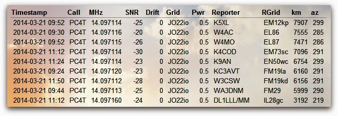 My daily routine, I start my day with CW on 14060 KHz. I listen for for activity. The last few days I worked OH9XX/P on 20m, I was using 5 watts. Yesterday UA2FAI, I was using 1 watt. Also worked RG3R with 1 watt but with JT9 on 10m. Of course all with the Yaesu FT817 and my end fed wire. Today we have nice spring weather. Sunny but a little cold about 1,5 C now at the moment. Yesterday also good results with WSPR into the USA with 500mW on 10m.