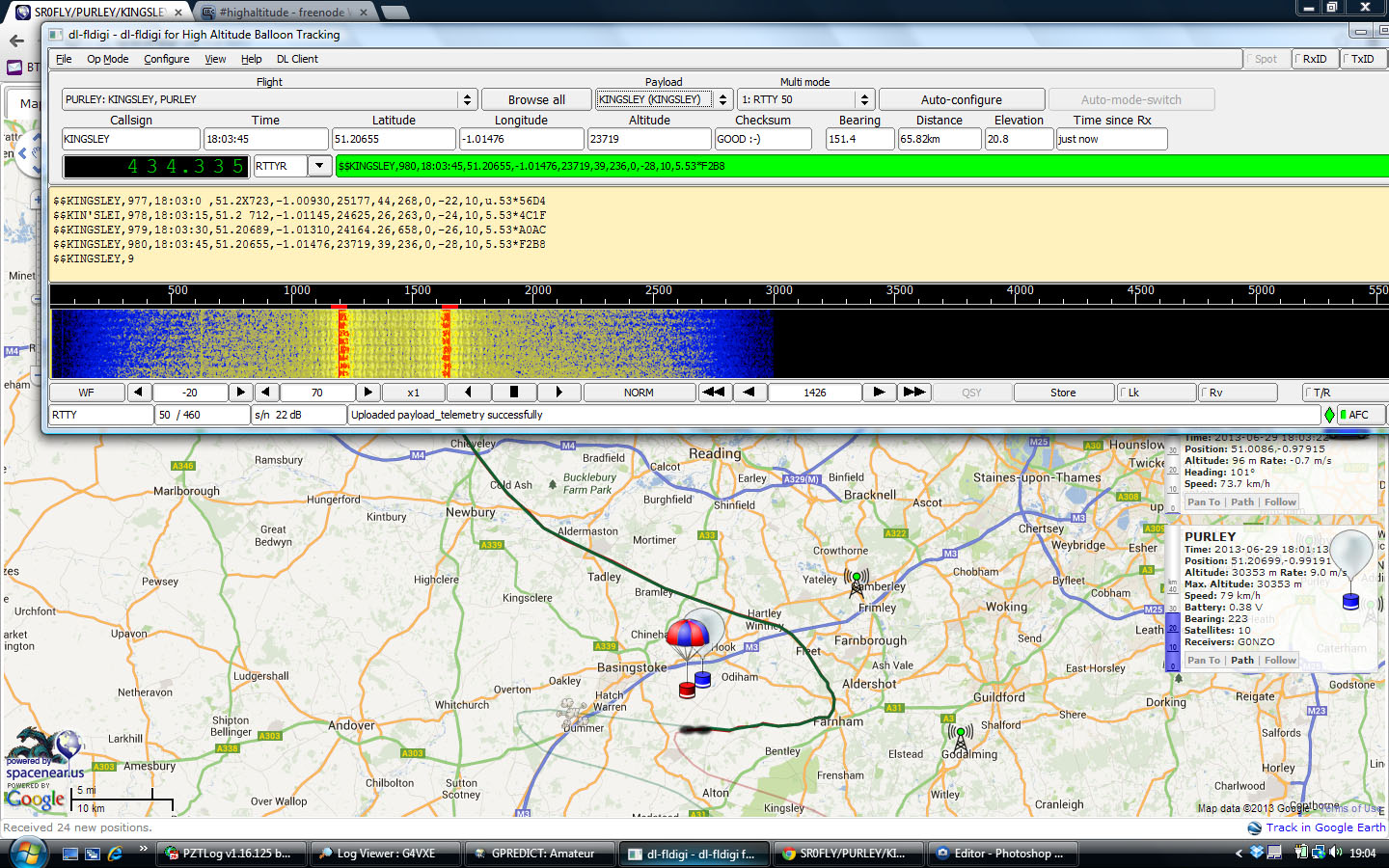 As ever, I didn’t really plan it, but at least I was downloading the DL-FLDIGI software as the balloons were being launched! Data about launches together with a plot about where the balloons currently launched are, is shown on the SpaceNear website