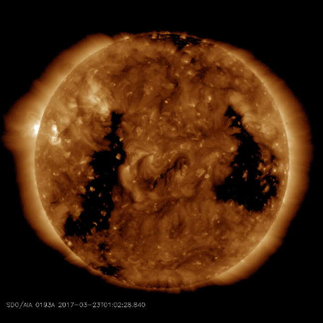It continues to blast earth with a never-ending series of coronal hole streams leading to periods of high signal absorption (particularly on the lower frequencies) and widespread auroras.