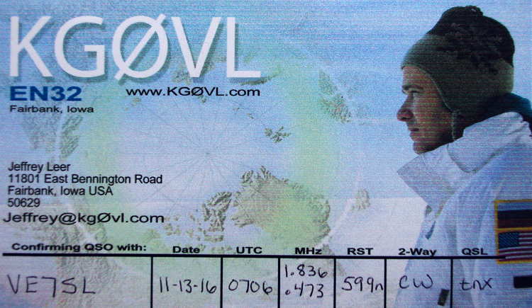 This week, the card from Jeffrey, KGØVL in Iowa arrived. This one also confirmed a 630m crossband contact. Both of these QSO's were made during the November's 630m activity night.
