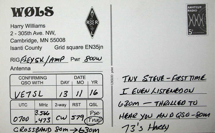 A very beautiful QSL arrived in the mail last week, confirming my 630m crossband contact with Harry, WØLS, in Minnesota.