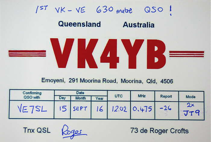 This is the first-ever QSO between North America and Australia on the relatively new 630m MF band. As well, at 11,802km, it presently represents the furthest two-way contact on this band, worldwide ... but I don't expect this record will last very long once the U.S. gets the band as I believe Roger's fine station is very capable of reaching much further afield.