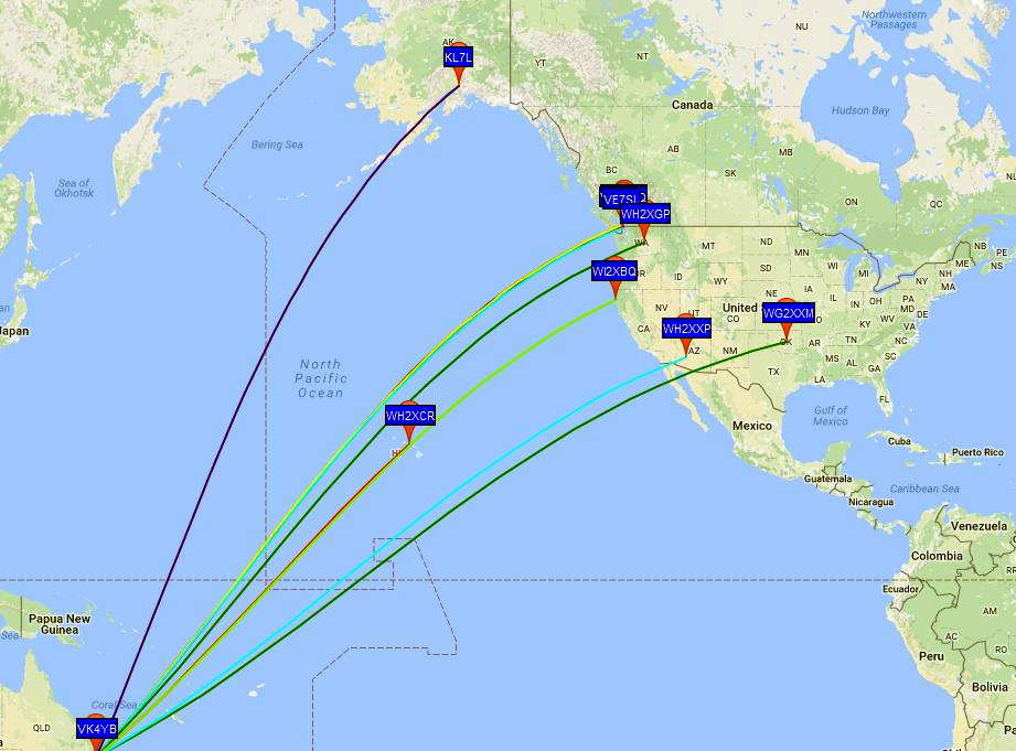 With stormy conditions continuing throughout the week, Friday's path to down-under enjoyed some enhancement as well, not unusual when the east-west path is disturbed. VK4YB's 90 watt signal was widely heard by several VE7's (VE7CNF, VA7MM and VE7BDQ) in the predawn hour, as Roger's signal peaked up briefly for several WSPR decodes.