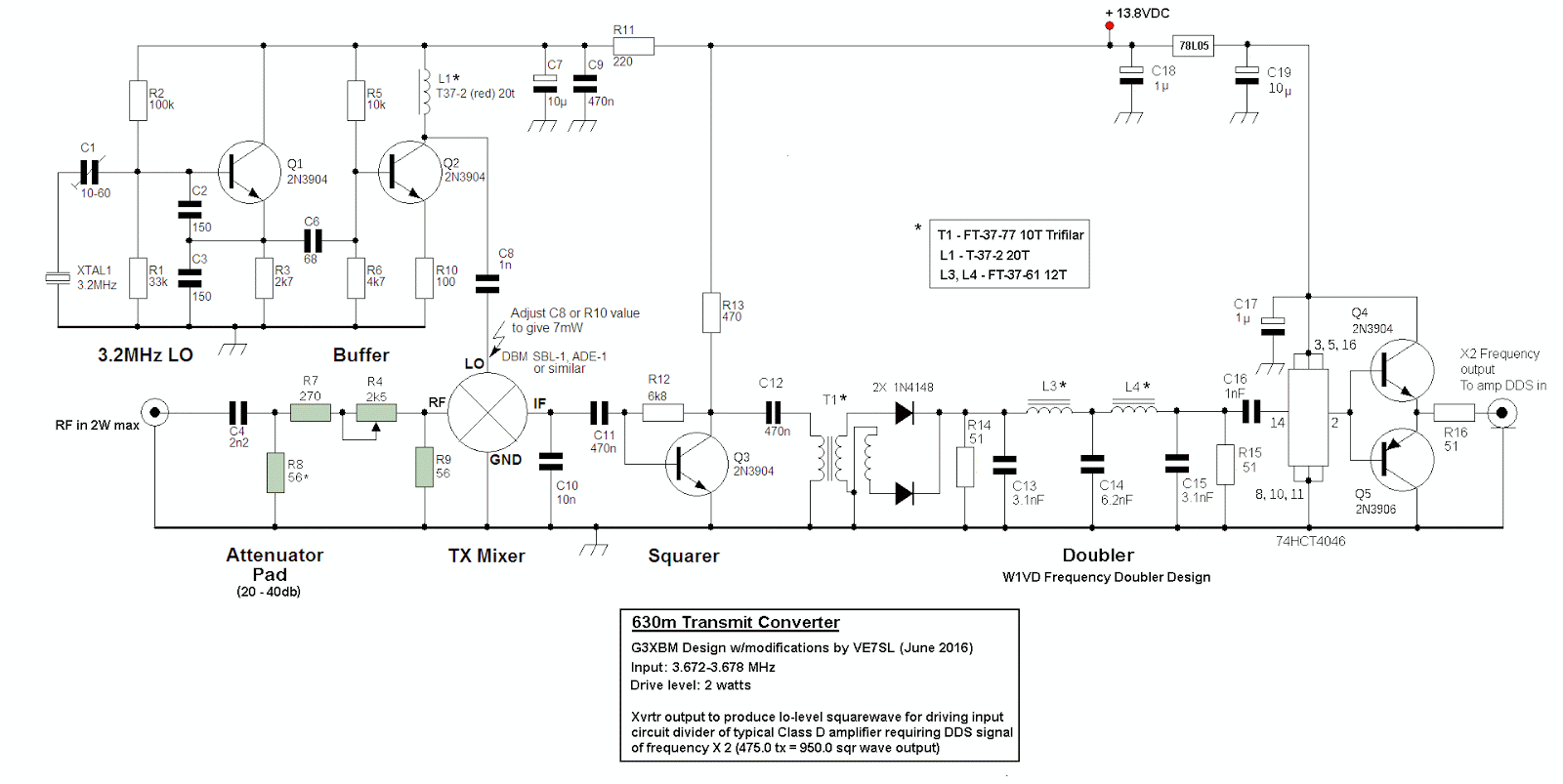 My circuit is basically a G3XBM 630m transverter, without the FET final amplifier. Instead, the driver feeds a full-wave rectifier frequency doubler for 630m, designed and published a few years ago by Jay, W1VD. Although I can get a squarewave end result, I think harmonics creeping into the process earlier down the mixing chain are causing non-symmetry in the output.