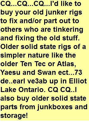 Earl specializes in solid state devices of all description, from vintage to modern. He offers a vast selection of parts for older radios and has information on repairing dozens of older solid state rigs. All parts are tested or guaranteed to be working within specs.