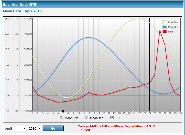 With several QSL's from last month's EME action now arriving, April's 'best days' have just concluded. For me, operating with no antenna elevation, 'best days' mean those with northern-most lunar declinations (these put the moon rising clearly and almost directly out in front of the house, not in the neighbour's trees); not having the moon near the sun and also, having the moon closer to perigee (closest approach to earth) rather than apogee (furthest from earth). With just a single 9 element yagi, every db is precious.