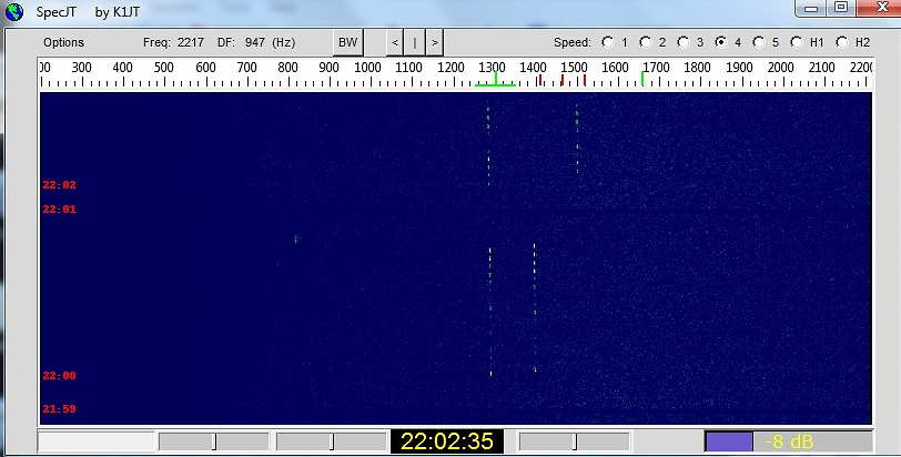 This month also provided my first glimpse of a 2m DX 'pileup', when J8/WW2DX in the Grenadine Islands showed up, calling CQ via the moon. My screen shot below shows at least 12 different stations calling him during his one-minute listening period ... some not yet 'warmed-up' as seen by their drifting oscillators.With several of the signals audible, it was an amazing thing to observe.