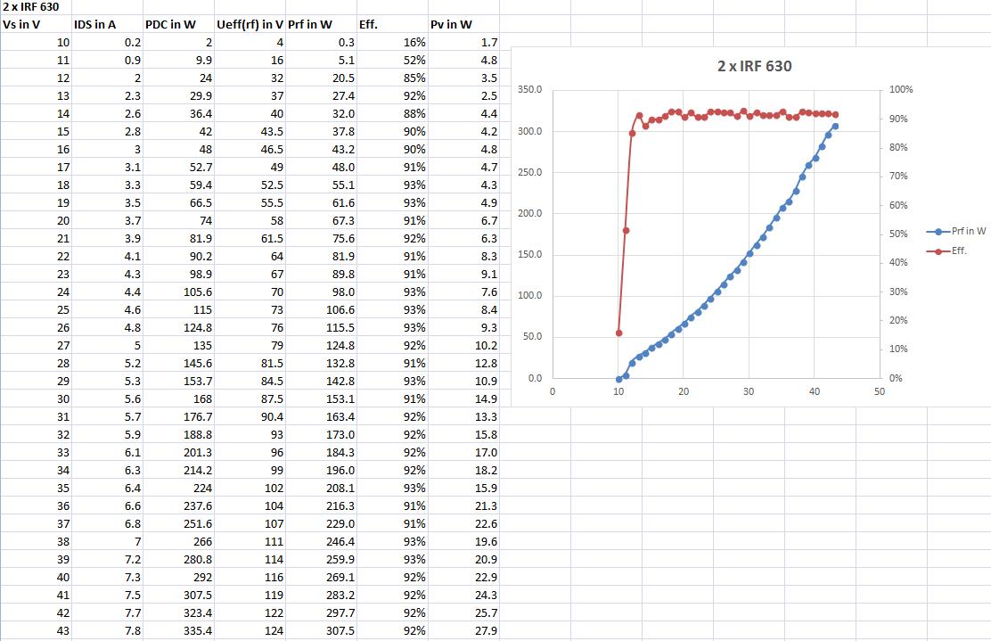 I have seen on your Website, that you are also a MF/LF fan and builder of GW3UEP QTX. I build the version with 2 IRF540 as you proposed and the same version with 2 IRF630. As I bought some time ago a PSU with can be regulated from 1V to 60V and max 10A (it is a Manson HCS 3404) I made some measurements on both version. Find attached an Excel with the measurements I made, if you are interested in.