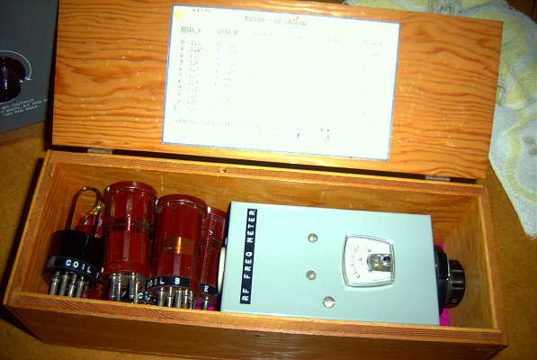I plugged-in the 15/20m plate coil and got out my old homebrew RF-sniffer / wavemeter. It was the first piece of gear that I built, as a new 15 year-old ham, and the poor man's spectrum analyzer has been in constant use ever since. Using the 40m crystal's third harmonic, I have found the wavemeter is the easiest way to avoid mistuning and quickly found myself with just over 5 watts of RF ready to go. A tune-up for 20m later, found the second harmonic producing about 10 watts of pile-up generating madness.