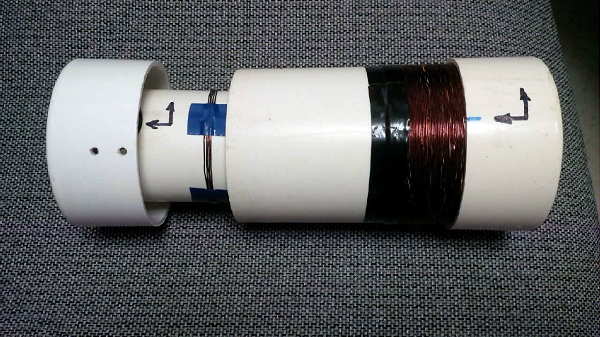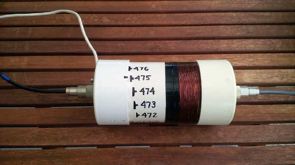 "You can see the white slider knob at the lower left, which goes through a slot in the outer pipe and screws into the end of the inner pipe. The white wire at the right goes to the matching transformer, and the black high-voltage wire at the left goes to the antenna. The coil is wound with #14 so it can handle some power. There are ventilation holes around the pipe and at the ends, but at 200W I did not notice any warming. A regular rotating variometer may have slightly lower losses, but it would be larger and I wanted to make my tuner box small so I can hide it near the trees."