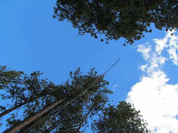Steve's new antenna consists of an 81' vertical wire, top-loaded with a 3-wire 68' x 8' tophat. His ground system now has over 4,000' of radials, ranging in size from 40'-130'.