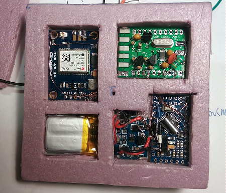 David, VE3KCL, used a special U3 firmware version of one of the kits available from QRP Labs and an Arduino Nano board driven by a QRP Labs Si5351A Synthesizer board. Special WSPR codes were used for vehicle telemetry which sent Callsign, Power, Locator, Altitude, Temperature, Battery, Groundspeed, GPS Status and Satellites Found. A 30m HF data download link was used with the help of a full-sized dipole hung between the system's two support balloons as well as a CW identifier on several other bands.
