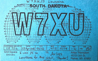 Some additional 630m band wallpaper also arrived over the summer from Arliss, W7XU. In mid-April, well-past the prime DX season, he ventured from his normal QTH in South Dakota to become W7XU/5 in Louisiana. I never in the world expected to even hear his small portable campground station let alone work him, but his signal was truly outstanding and we worked very quickly. Arliss gave me state #38 on 630m. We worked each other a few months later but this time on 2m during the August Perseids meteor shower when he was back at home in South Dakota.